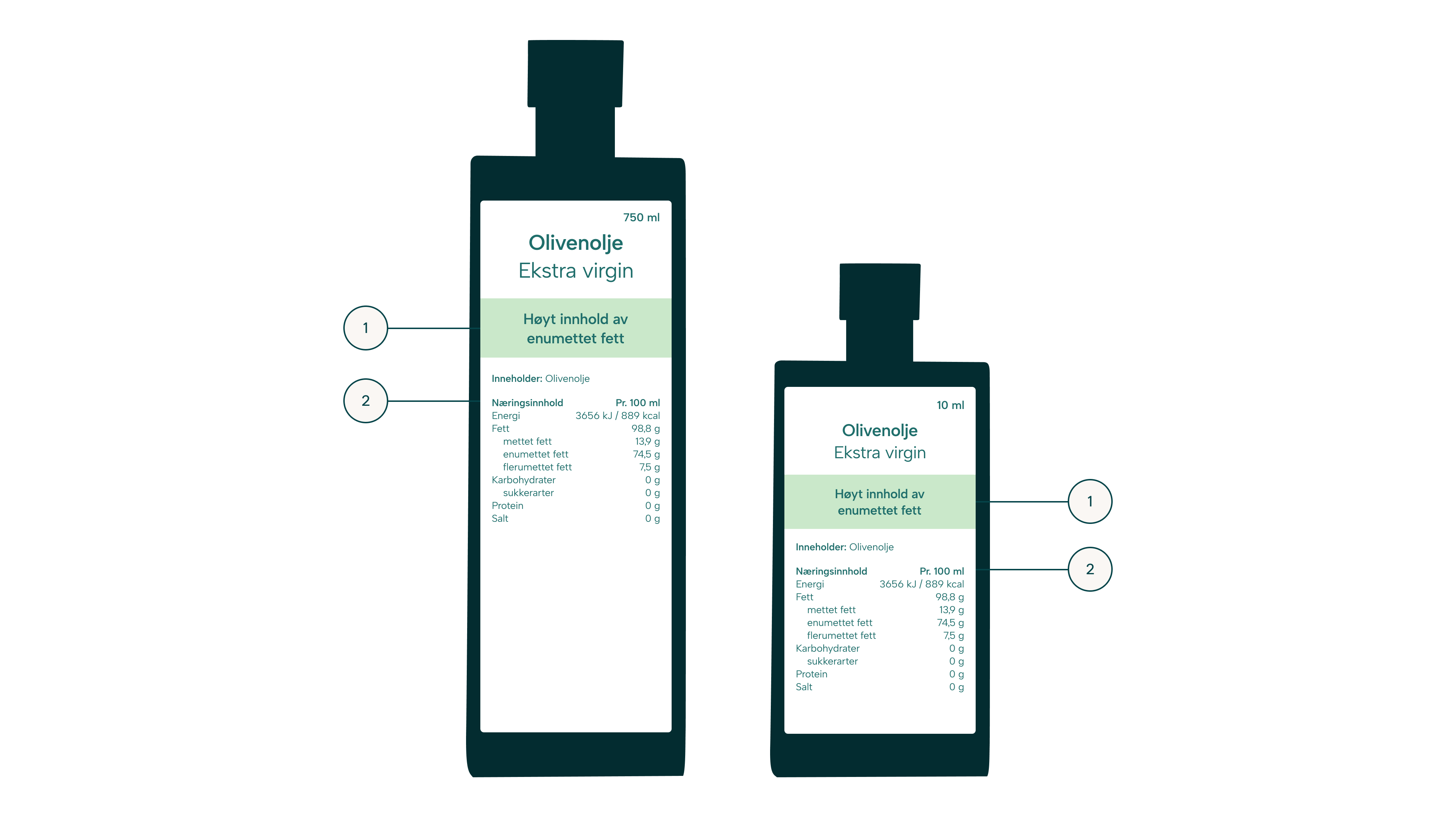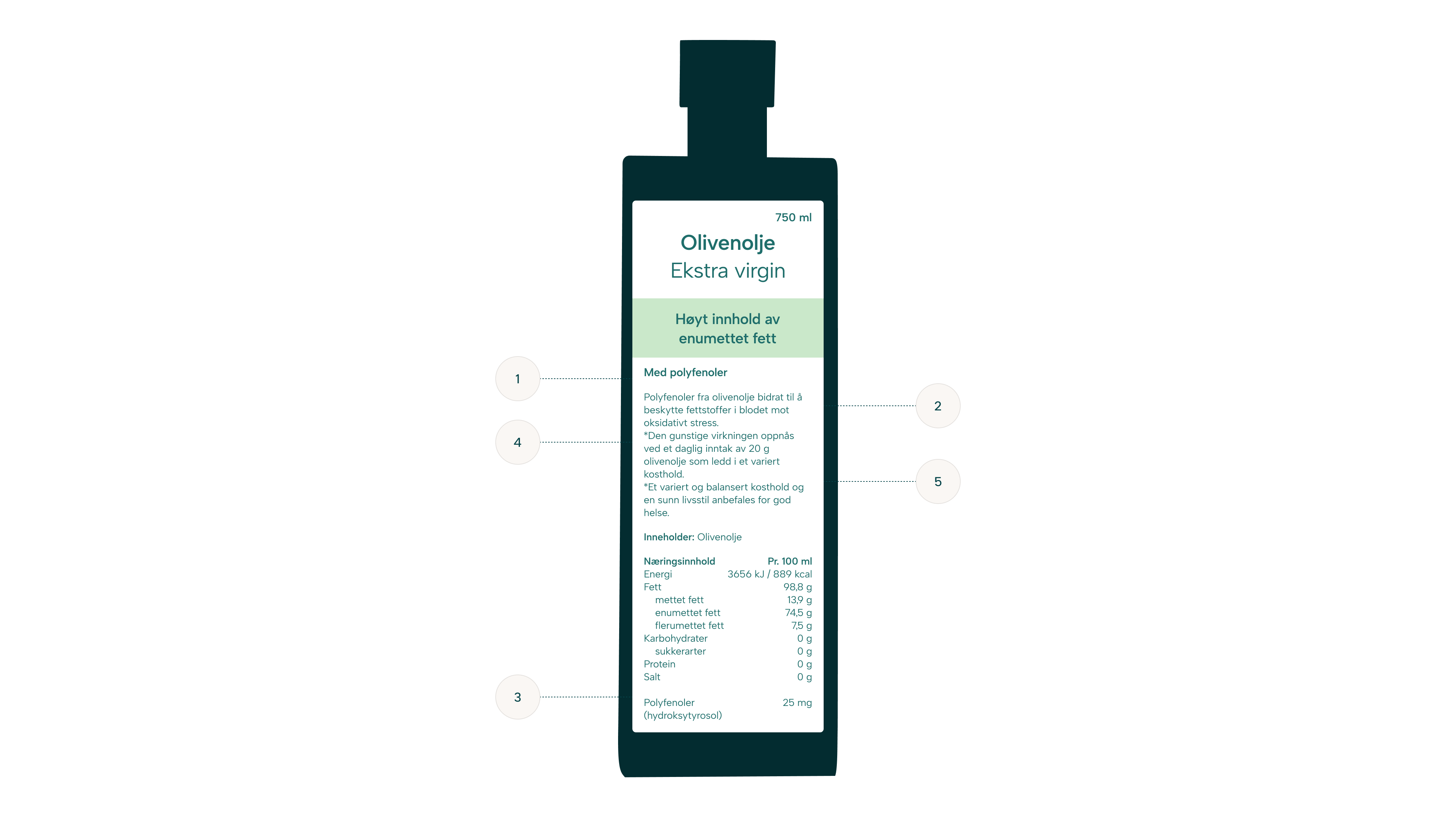 Når dere bruker en helsepåstand om et produkt, må dere også gi opplysninger om hvilken mengde næringsmiddel og hvilket bruksmønster som kreves for å oppnå den gunstige effekten, jf. påstandsforordningen artikkel 10 nr. 2 bokstav b. I dette tilfellet inngår dette kravet også i bruksbetingelsene for påstanden: «For at påstanden skal kunne brukes, skal forbrukeren opplyses om at den gunstige virkningen oppnås ved et daglig inntak av 20 g olivenolje».