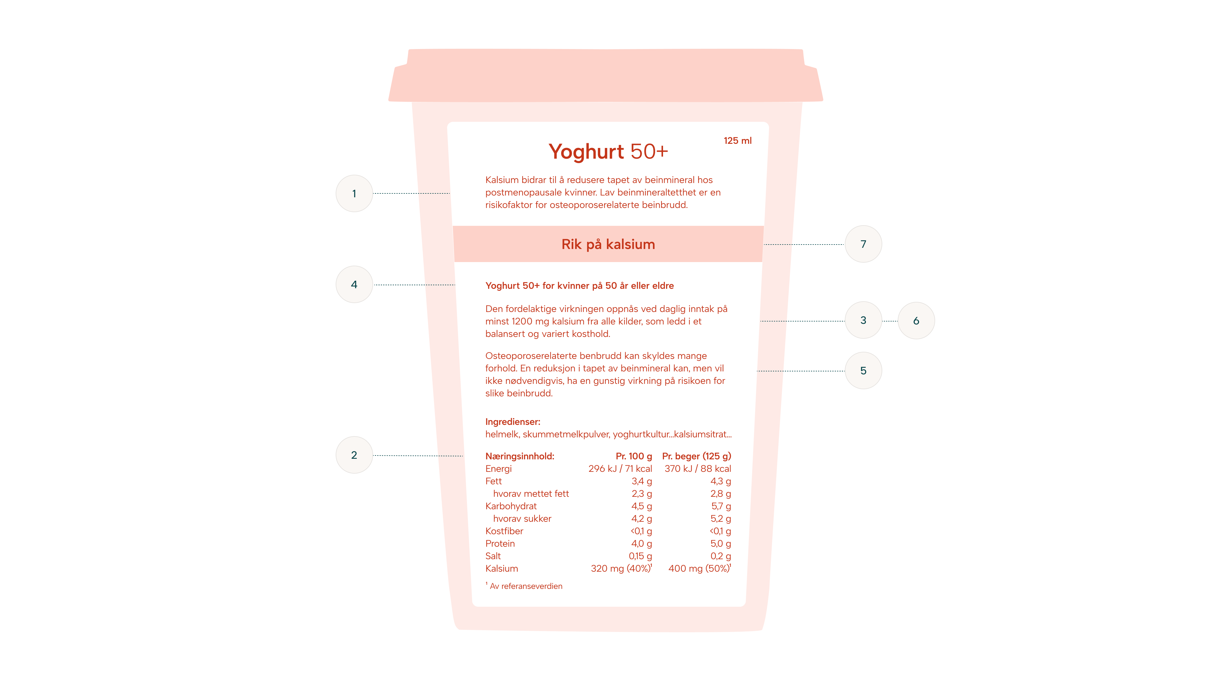 Når dere bruker en helsepåstand om et produkt, må dere også gi opplysninger om hvilken mengde næringsmiddel og hvilket bruksmønster som kreves for å oppnå den gunstige effekten, jf. påstandsforordningen artikkel 10 nr. 2 bokstav b. I dette tilfellet inngår disse opplysningene i vilkårene for bruk av påstanden: «Påstanden kan brukes bare om næringsmidler som minst inneholder 400 mg kalsium per porsjonsenhet. Forbrukeren skal informeres om at den fordelaktige virkningen oppnås ved et daglig inntak på minst 1200 mg kalsium fra alle kilder».