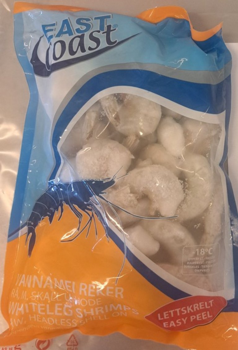 Freshline AS kaller tilbake frosne, rå vannameireker i pose. Posene inneholder reker med skall, uten hode, og er solgt i ulike rekestørrelser. Produktet er merket East Coast Whiteleg Shrimps, med best før datoer 15/10/2026 og 16/10/2026. Produktet er solgt til frittstående dagligvarebutikker i Sør- og Midt-Norge.